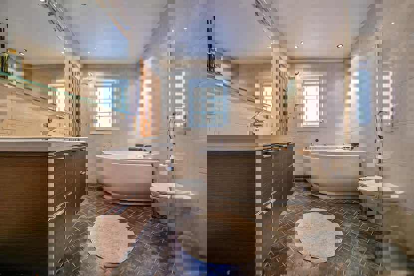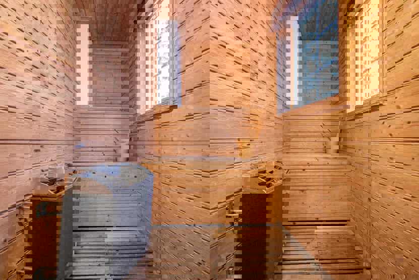 Bad 1: Bruser, WC. Bad 2: Bruser, WC, sauna og boblebad. Bad 3: med WC.