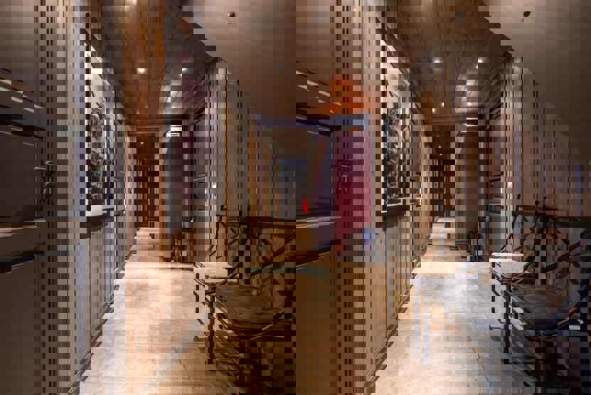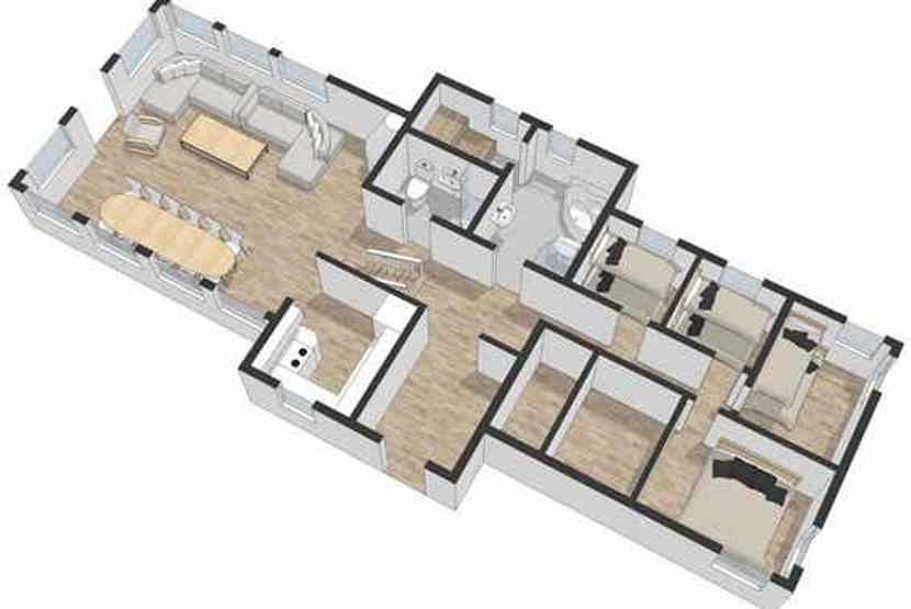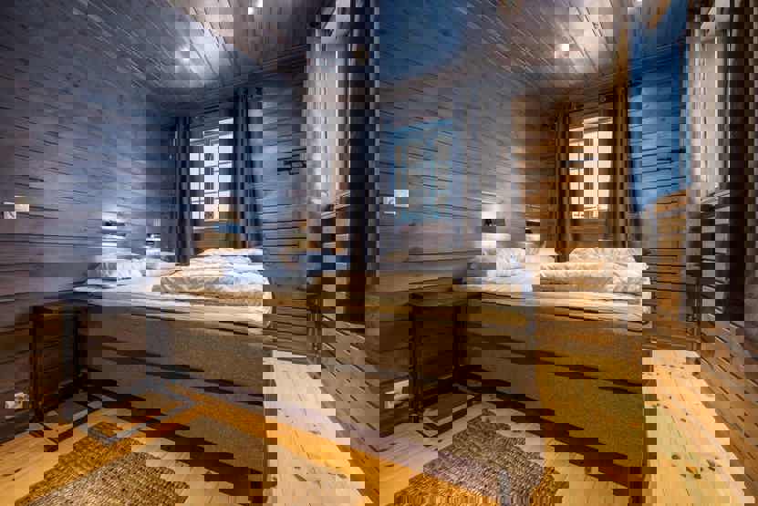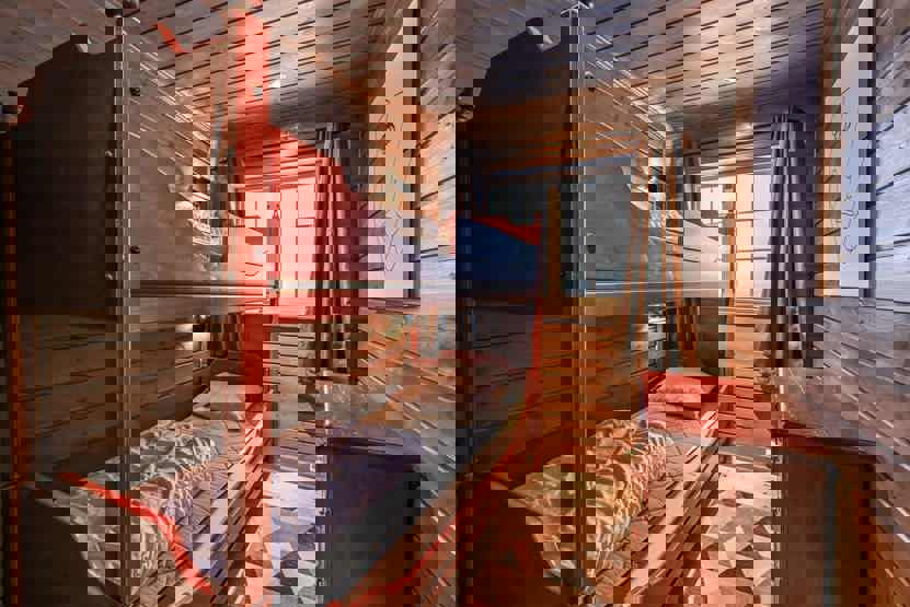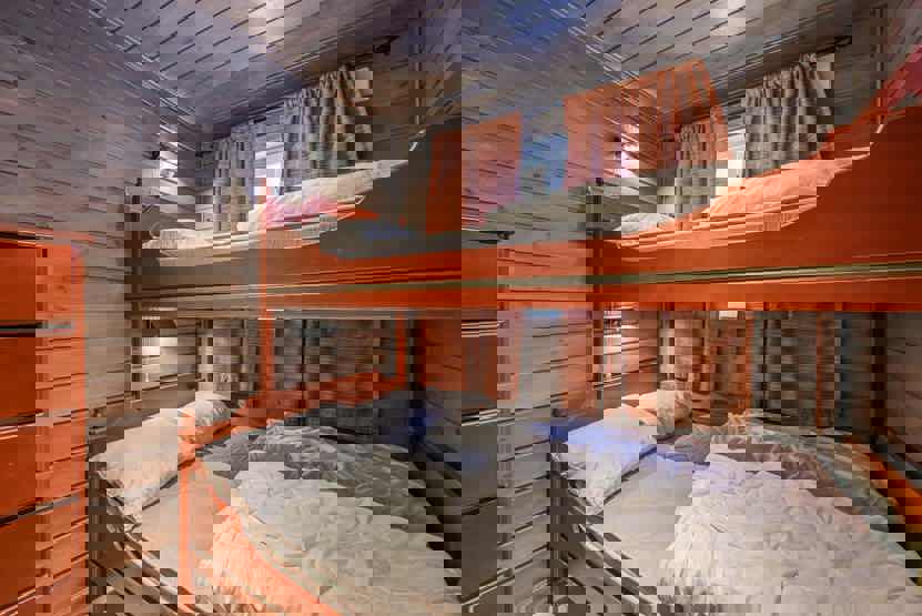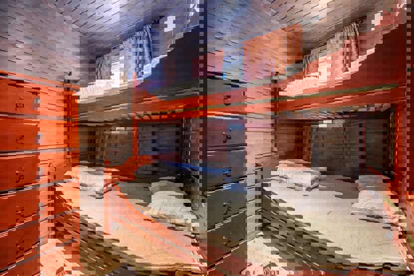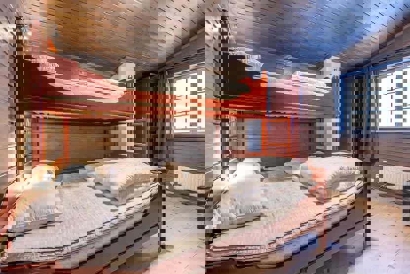 Soveværelse 1 + 2 : 1 dobbeltseng. Soveværelse 3 + 4: 1 køjeseng med 150 cm bred underkøje. Soveværelse 5: 1 køjeseng med 120 cm bred underkøje. Soveværelse 6: 1 køjeseng med 120 cm bred underkøje. Soveværelse 7: 1 køjeseng.