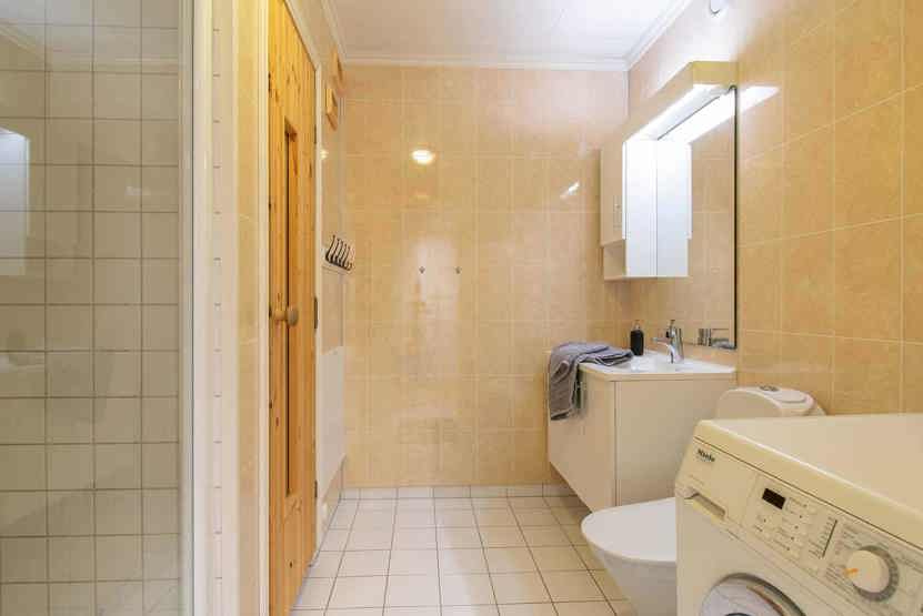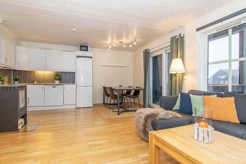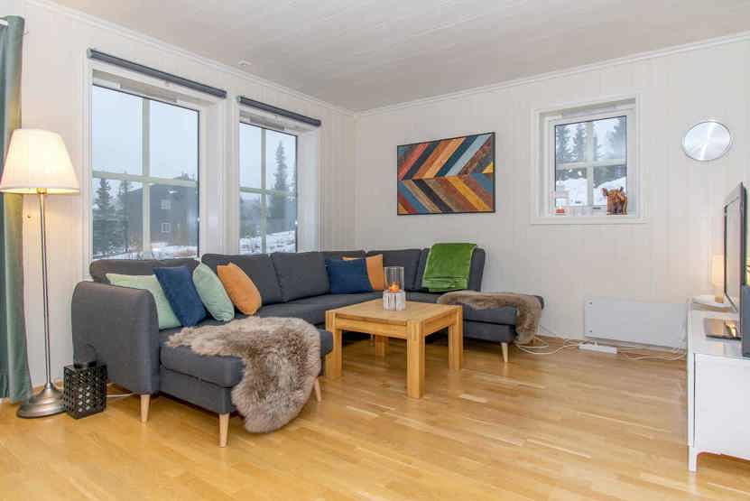 Lejlighed i stueetage, 6 sengepladser, 68 m², opholdsstue med brændeovn, TV og køkkenafdeling, 3 soveværelser, 1 bruser, 1 WC, 1 sauna. Vaskemaskine. Skiopbevaring.