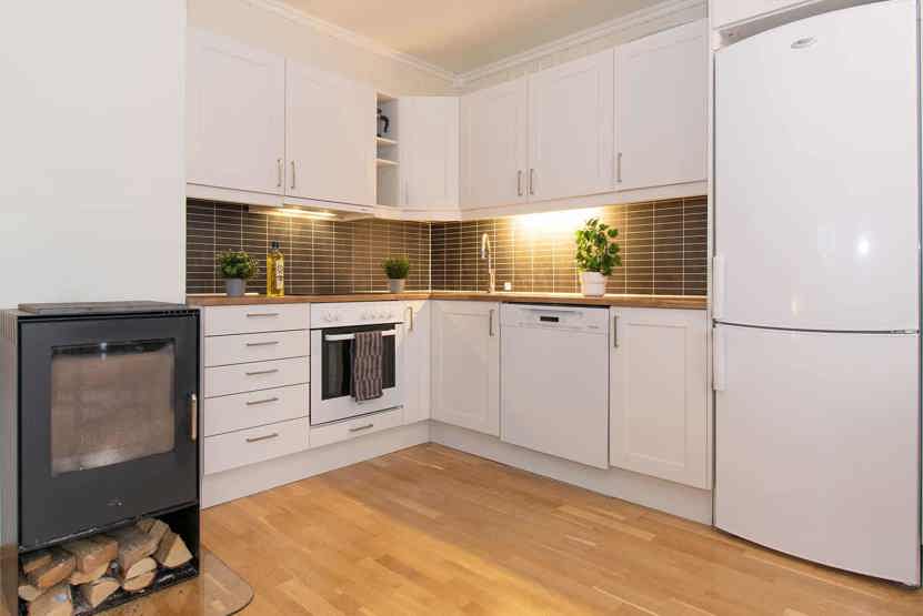 Køkken: Enheden har komfur med ovn, opvaskemaskine, mikrobølgeovn, køleskab, fryser.