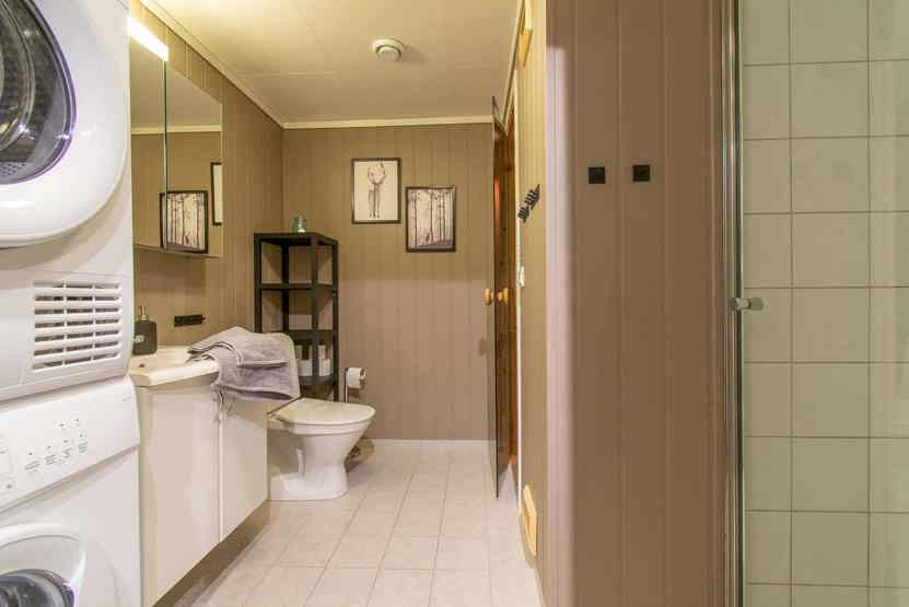Lejlighed i stueetage, 6 sengepladser, 68 m², opholdsstue med brændeovn, TV og køkkenafdeling, 3 soveværelser, 1 bruser, 1 WC. vaskemaskine, tørretumbler. Skiopbevaring.