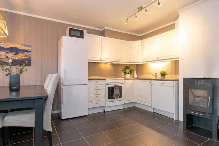 Køkken: Enheden har komfur med ovn, opvaskemaskine, mikrobølgeovn, køleskab, fryser.