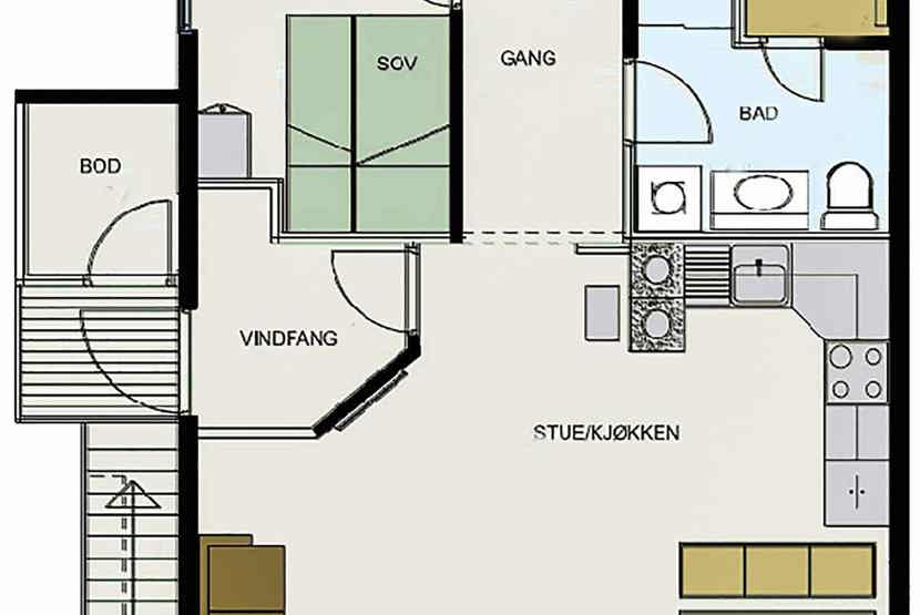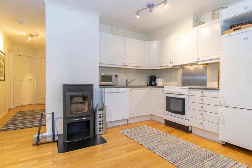 Lejlighed i stueetage, 6 sengepladser, 68 m², opholdsstue med brændeovn, TV og køkkenafdeling, 3 soveværelser, 1 bruser, 1 WC, 1 sauna. Vaskemaskine, 1 skotørrer. Skiopbevaring.