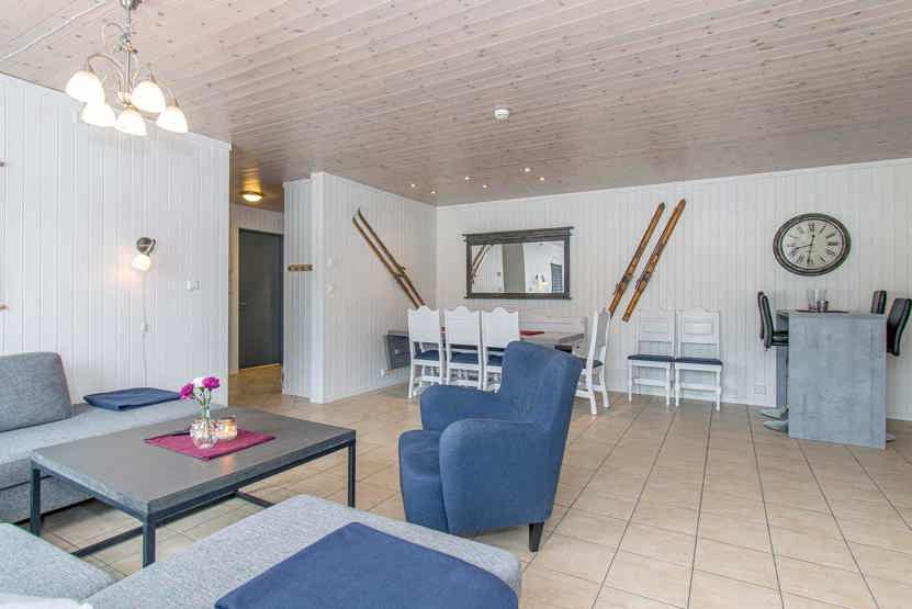 Lejlighed i stueetagen, 8 sengepladser, 77 m², kombineret opholdsstue med TV, køkkenafdeling, 3 soveværelser, 1 bruser, 1 WC, vaskemaskine. 1 garageplads maks højde 225 cm, 3 skotørrer, Elevator findes i huset.