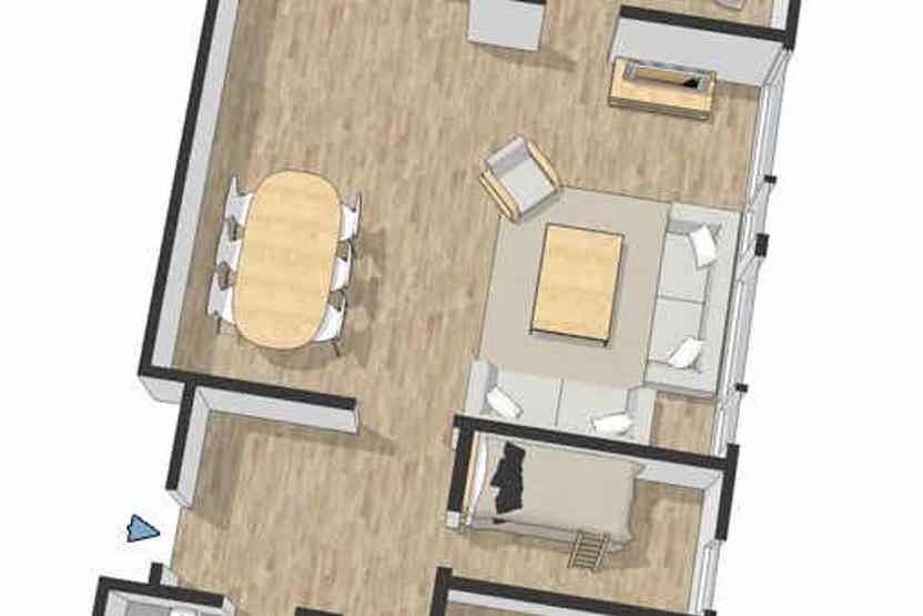Lejlighed på 1.sal, 6 sengepladser, 77 m², kombineret opholdsstue med TV, køkkenafdeling, 3 soveværelser, 1 bruser, 1 WC. 1 garageplads maks højde 225 cm, 3 skotørrer, Elevator findes i huset.