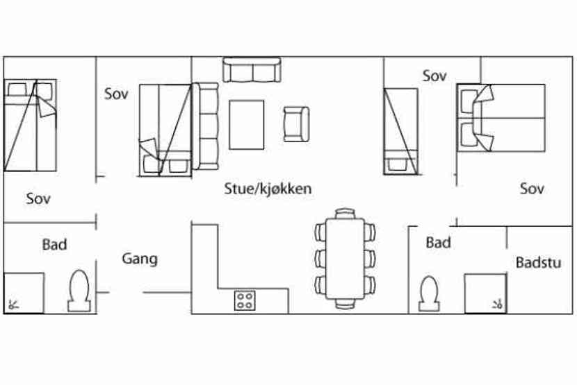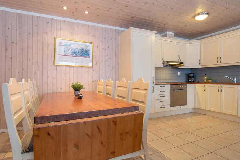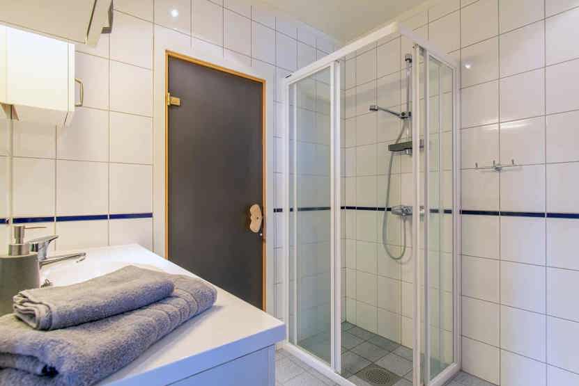 Lejlighed på 1.sal, 8 sengepladser, 87 m², kombineret opholdsstue med TV, køkkenafdeling, 4 soveværelser, 2 bruser, 2 WC, sauna. vaskemaskine. 2 garagepladser makser højde 225 cm, 3 skotørrer, Elevator findes i huset.