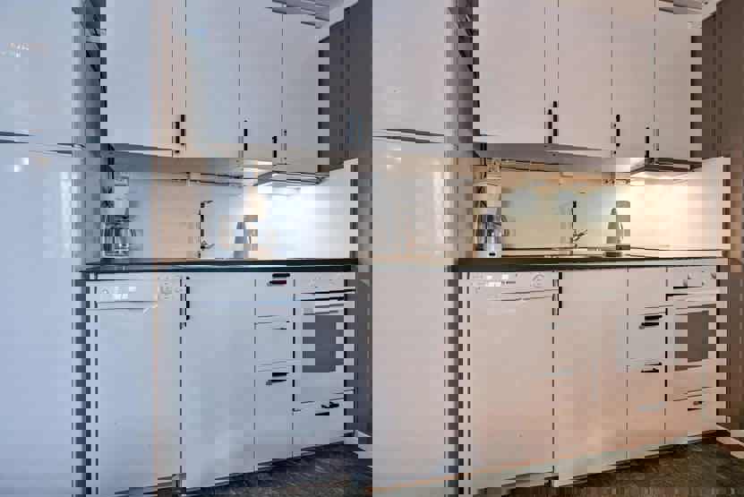 Køkken: Enheden har komfur med ovn, opvaskemaskine, mikrobølgeovn, køleskab, fryser.