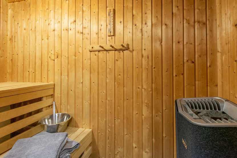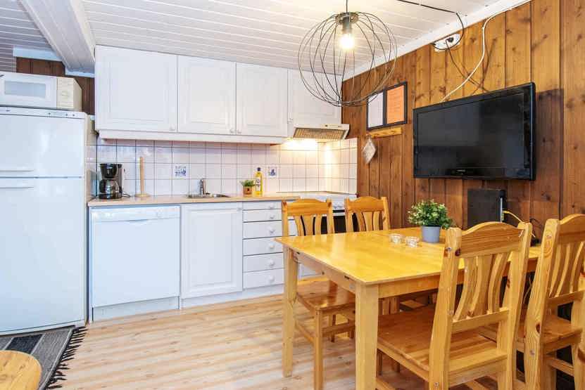 Lejlighed i underetagen, 6 sengepladser, 50 m², opholdsstue med TV, brændeovn og køkkenafdeling, 2 soveværelser. 1 bruser, 1 WC, 1 sauna.