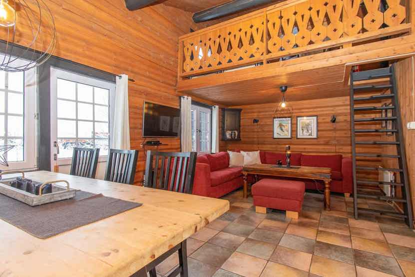 Lejlighed med hems, 4+2 sengepladser, 67 m², opholdsstue med TV, og køkkenafdeling, 2 soveværelser. Stejl stige til hems, 1 bruser, 1 WC, 1 sauna.