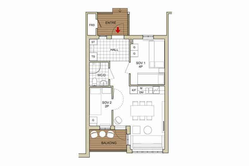 Åre Fjällby ligger i Åre By. Lejlighed på første etage, 6 sengepladser, 45 kvm, alrum med køkkenafdeling, 2 soveværelse, 1 bruser, 1 WC.