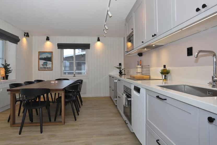 Køkkenet indeholder elkomfur med ovn, køleskab med fryser, opvaskemaskine, mikro.