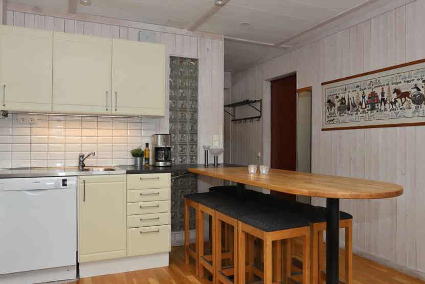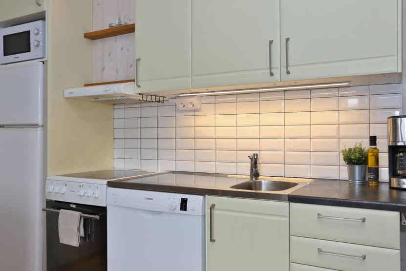 Køkkenet indeholder elkomfur med ovn, køleskab med fryser, opvaskemaskine.