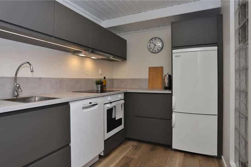 Køkkenet indeholder komfur, ovn, køleskab med fryser, opvaskemaskine, mikro.