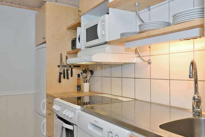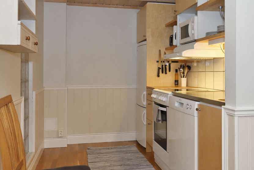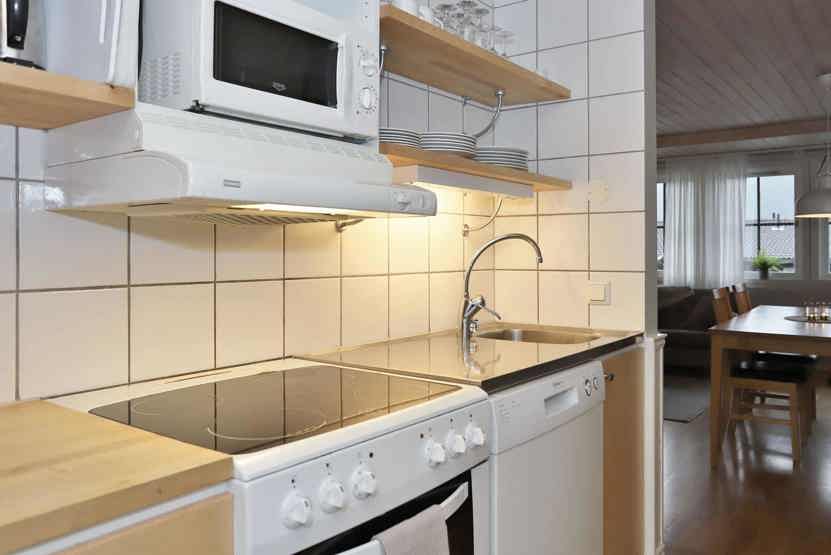 Køkkenet indeholder komfur, ovn, køleskab med fryser, opvaskemaskine, mikro.