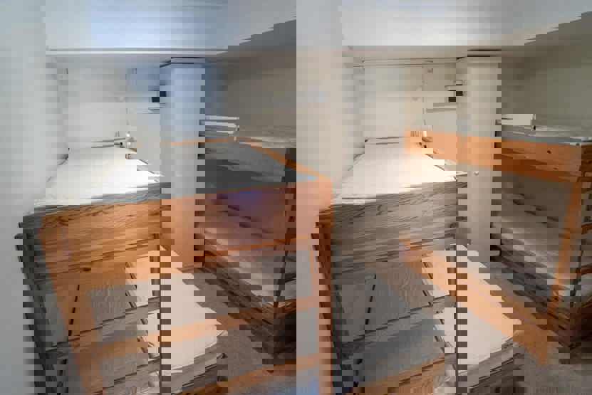 Soveværelse-1 = 1 køjeseng hvor både over og underkøje er 90 cm bred, 1 køjeseng med 160 cm bred underkøje.