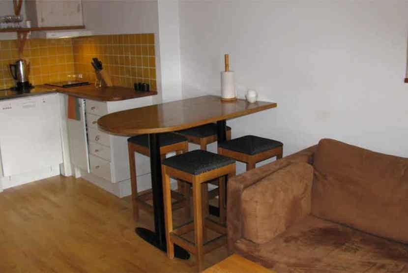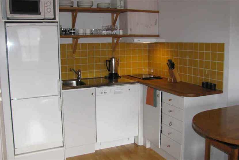 Køkkenet indeholder komfur, køleskab med fryser, opvaskemaskine, mikrobølgeovn (ikke normal ovn).