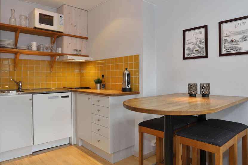 Køkkenet indeholder komfur, mikrobølgeovn (ikke normal ovn), køleskab med fryser, opvaskemaskine.