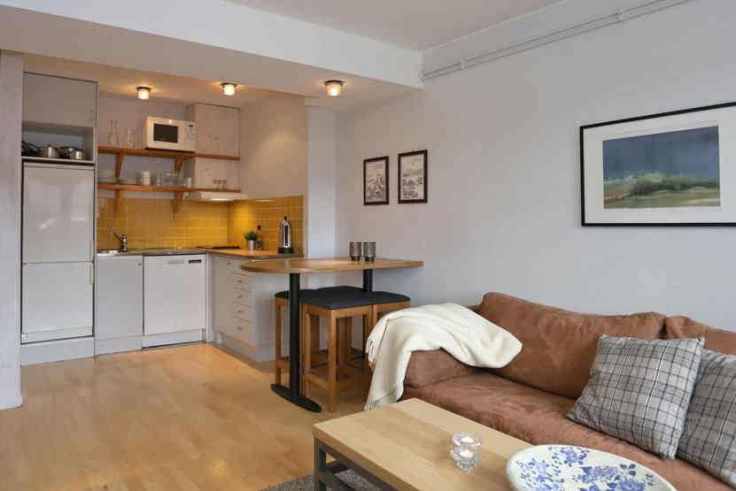 Stue med køkkenafdeling, sovesofa til 2 personer.