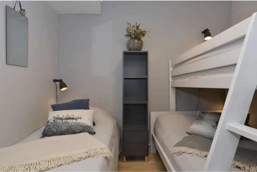 Alkove 1 =1 enkeltseng, 1 køjeseng med 120 cm bred underkøje og 80 cm bred overkøje.