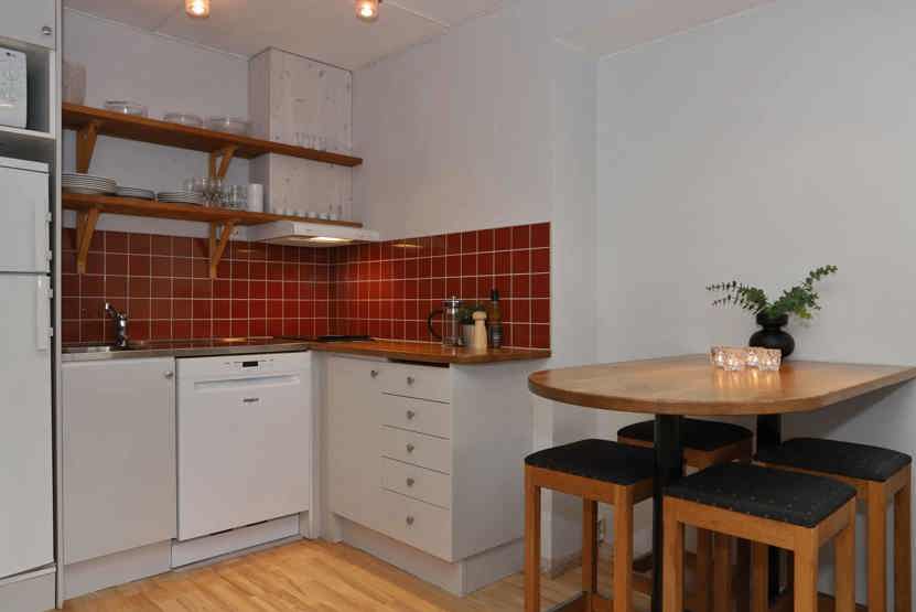 Køkkenet indeholder komfur, mikrobølgeovn (ikke normal ovn), køleskab med fryser, opvaskemaskine.