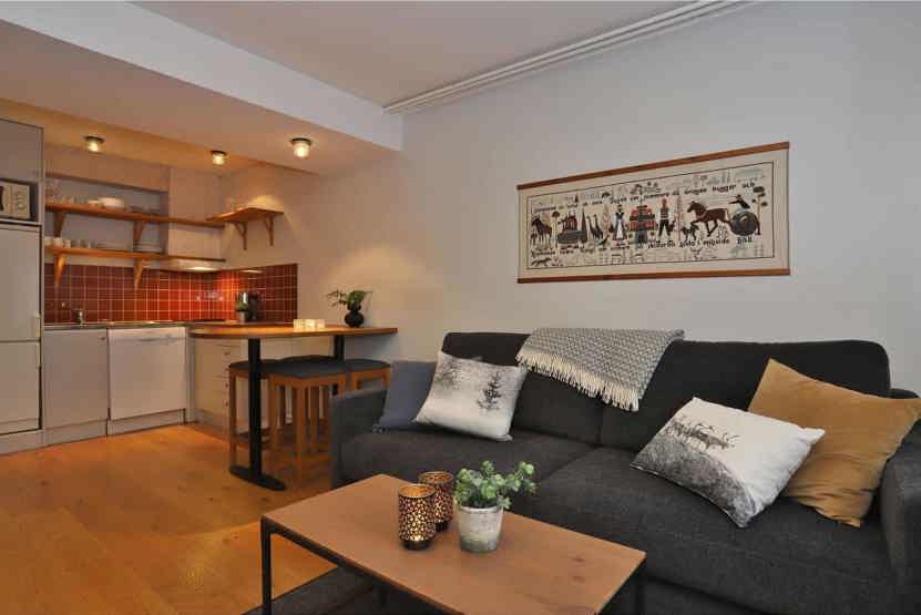 Stue med køkkenafdeling, sovesofa til 1 person.