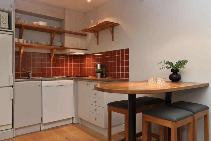 Køkkenet indeholder komfur, mikrobølgeovn (ikke normal ovn), køleskab med fryser, opvaskemaskine.