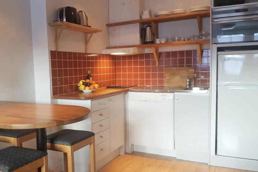Køkkenet indeholder komfur, kombineret mikro- og varmluftsovn, køleskab med fryser, opvaskemaskine.
