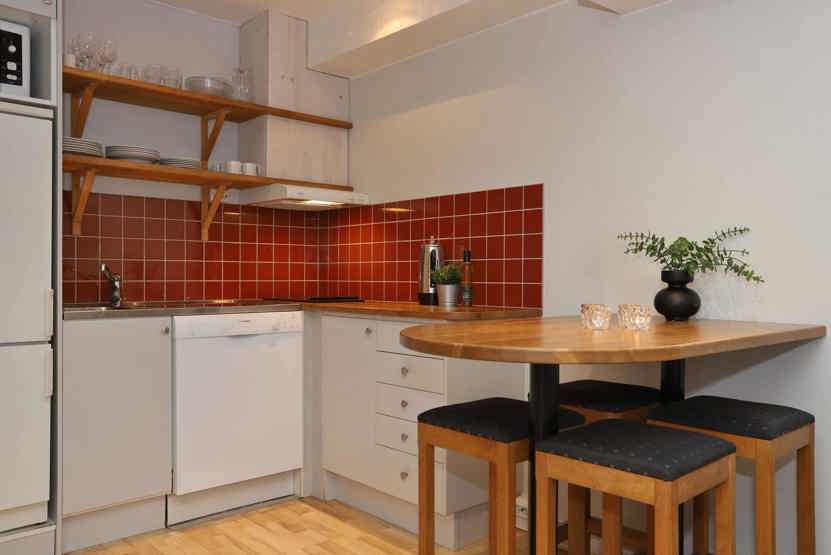 Køkkenet indeholder komfur, mikrobølgeovn (ikke normal ovn), køleskab med fryser, opvaskemaskine.