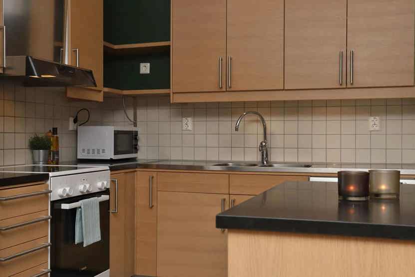 Køkkenet indeholder elkomfur med ovn, køleskab med fryser, opvaskemaskine, mikro.