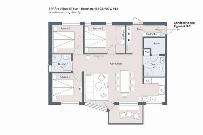 Åre Village ligger i Åre By. Lejlighed på første etage, stueetage, 6+2 sengepladser, 87 kvm, alrum med køkkenafdeling, 3 soveværelse, 2 brusere, 2 WC, sauna.