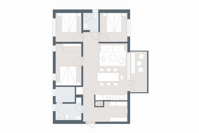Soveværelse-1 = 1 dobbeltseng. Soveværelse-2 = 1 dobbeltseng. Soveværelse-3 = 1 dobbeltseng, 1 køjeseng i et sengeskab.