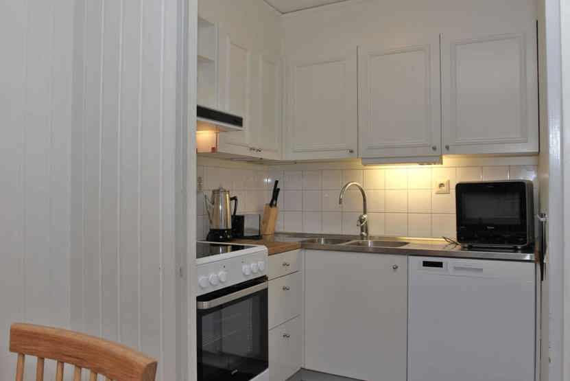 Køkkenet indeholder elkomfur med ovn, køleskab med fryser, opvaskemaskine, mikro.