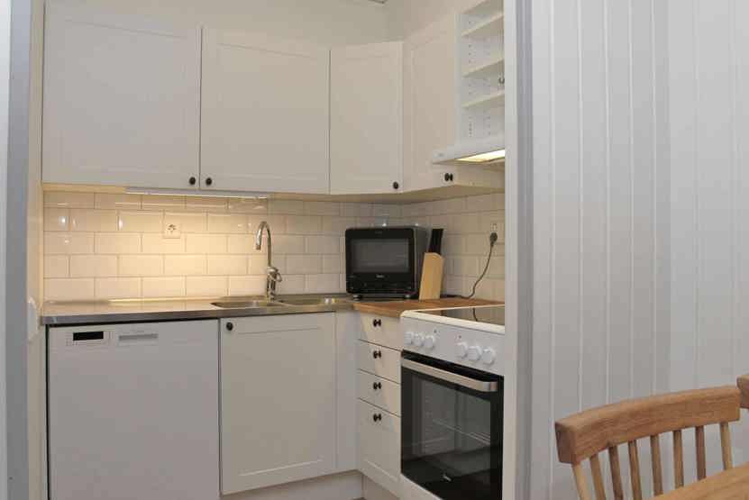 Køkkenet indeholder elkomfur med ovn, køleskab med fryser, opvaskemaskine, mikro.
