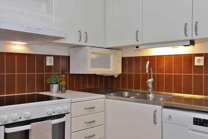 Køkkenet indeholder elkomfur med ovn, køleskab med fryser, opvaskemaskine, mikro.