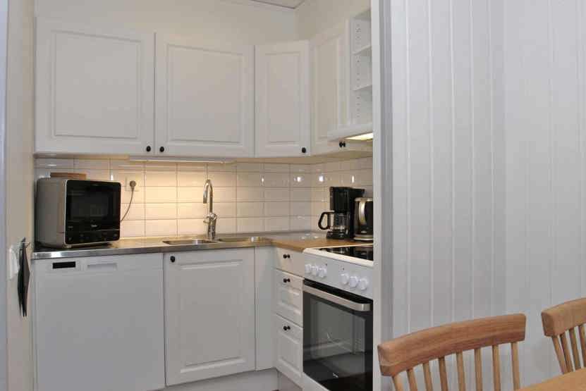 Køkkenet indeholder elkomfur med ovn, køleskab med fryser, opvaskemaskine, mikro.