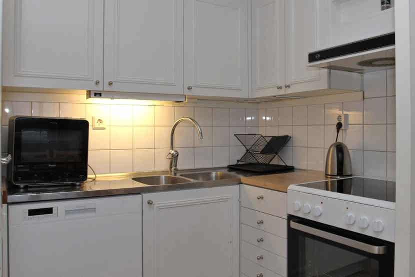 Køkkenet indeholder elkomfur med ovn, køleskab med fryser, opvaskemaskine, mikro.