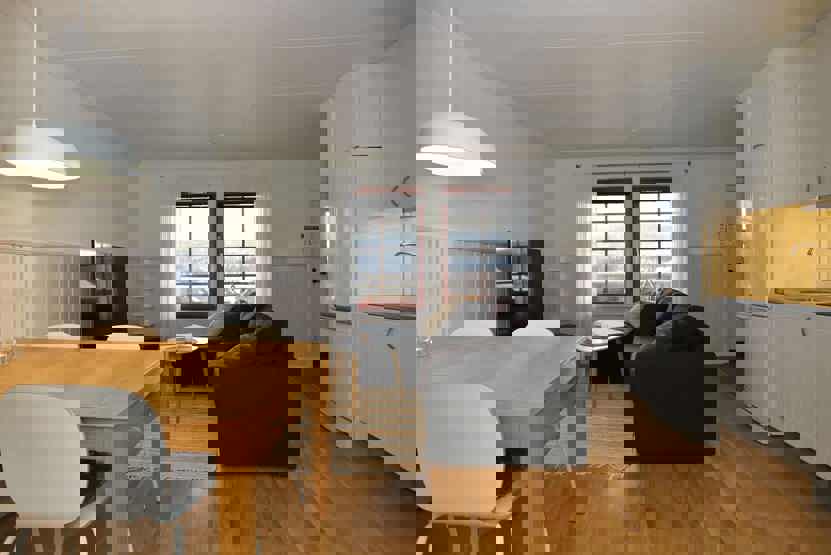 Stue med køkkenafdeling.