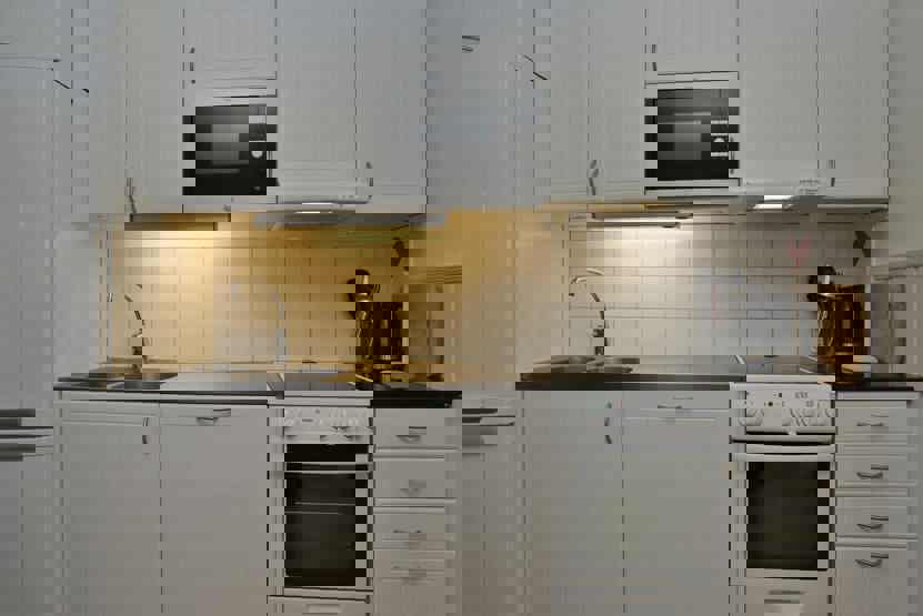 Køkkenet indeholder elkomfur med ovn, opvaskemaskine, mikro, køleskab med fryser.