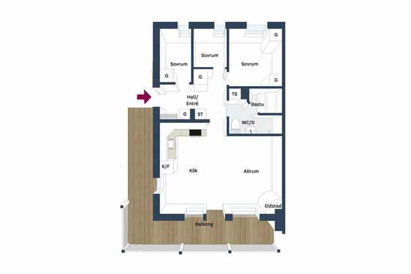 Stue med køkkenafdeling.