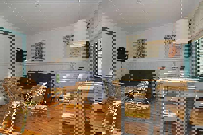 Soveværelse-1 = 1 køjeseng hvor både over og underkøje er 90 cm bred. Soveværelse-2 = 1 køyeseng med 140 cm bred underkøye og 90 cm bred overkøye.