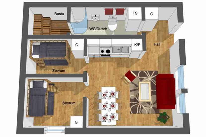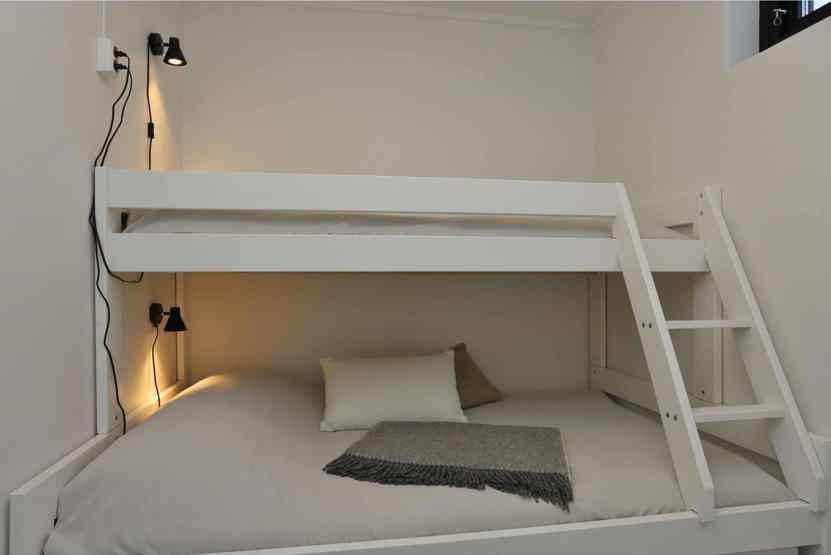 Soveværelse-1 = 1 køjeseng hvor både over og underkøje er 90 cm bred. Soveværelse-2 = 1 køyeseng med 120 cm bred underkøye og 80 cm bred overkøye.