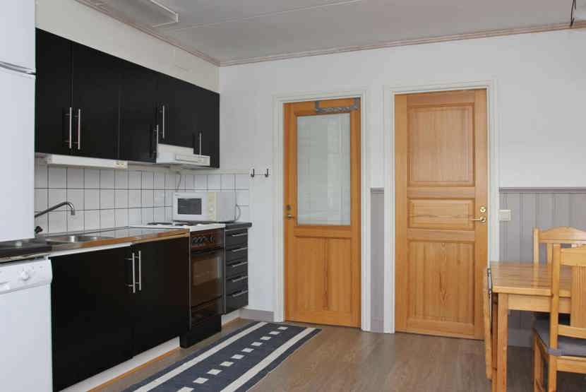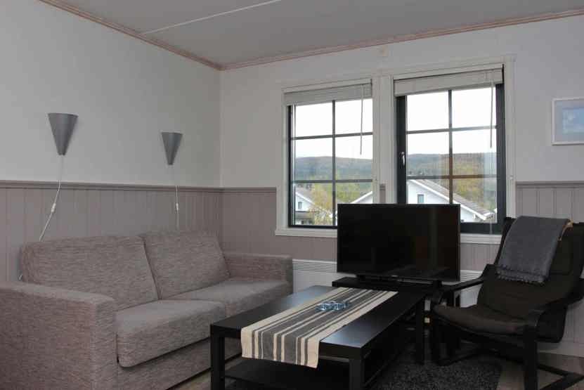 Stue med køkkenafdeling. TV, tørreskab, skiopbevaring, parkering med motorvarmeplads.