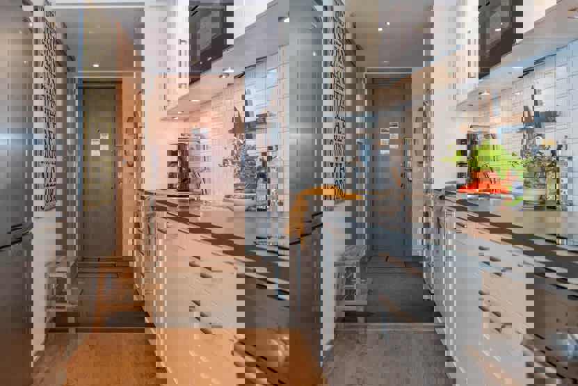 Køkkenet indeholder komfur med ovn, køleskab med fryser, opvaskemaskine, mikro.