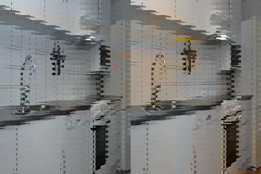 Køkkenet indeholder elkomfur med ovn, køleskab og fryser, opvaskemaskine, mikro.