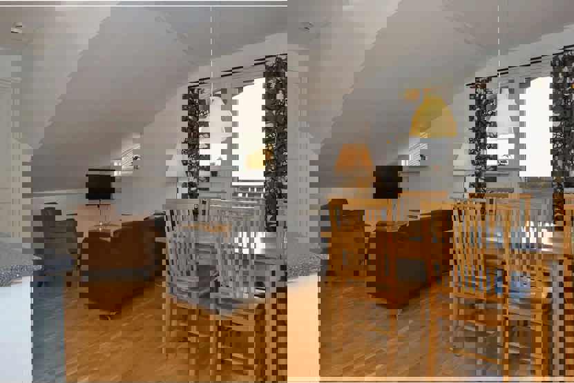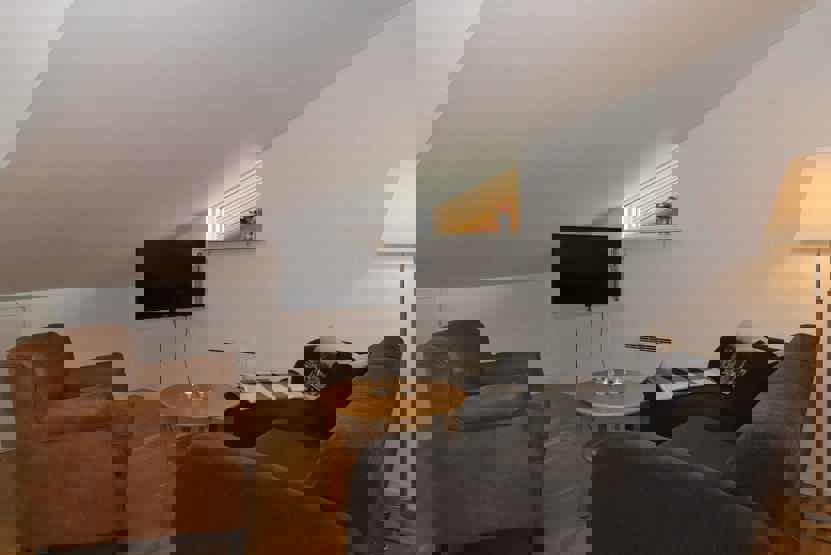 Stue med køkkenafdeling. TV, skiopbevaring.