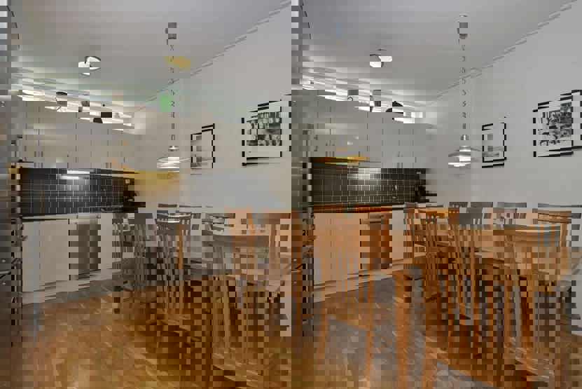 Køkkenet indeholder komfur med ovn, mikro, køleskab og fryser, opvaskemaskine.
