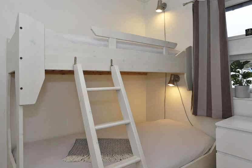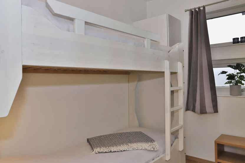 Soveværelse-1 = 1 dobbeltseng 180 cm bred. Soveværelse-2 = 1 køjeseng med 120 cm bred underkøje og 80 cm bred overkøje. Soveværelse-3 = 1 køjeseng hvor både over og underkøje er 80 cm bred.