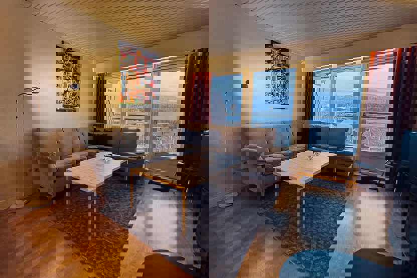 Stue med lille køkkenafdeling. TV, brændeovn (brænde indgår ikke), balkon mod syd, skiopbevaring, Parkeringsplads finnes, motorvarmeplads afhængig af tilgængelighed, adgang til fælles elbilopladere med type 2 stik mod betaling.