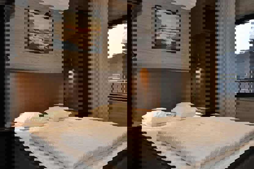 Soveværelse-1 = 1 dobbeltseng. Soveværelse-2 = 1 køjeseng med 120 cm bred underkøje, soveværelse uden vinduer.