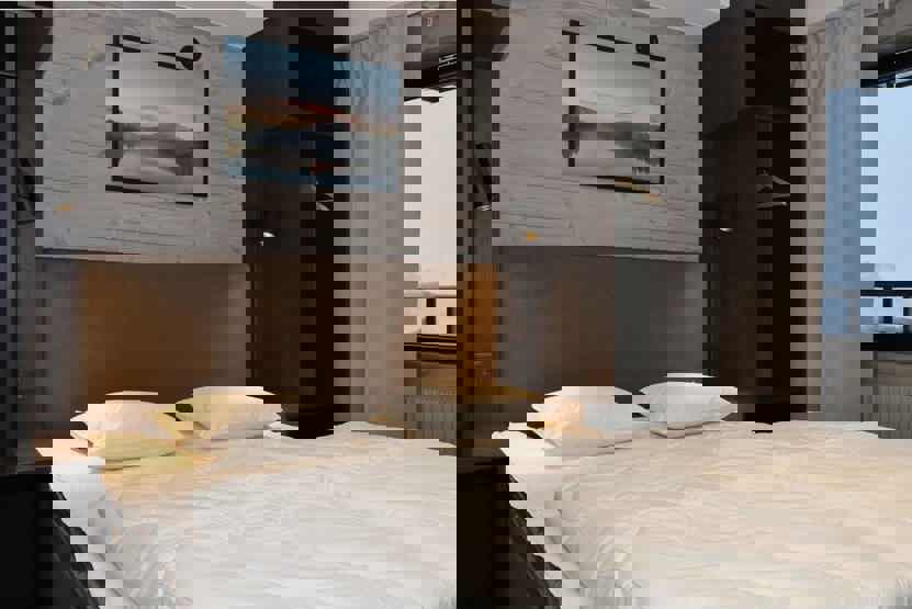 Soveværelse-1 = 1 dobbeltseng. Soveværelse-2 = 1 køjeseng med 120 cm bred underkøje, soveværelse uden vinduer.